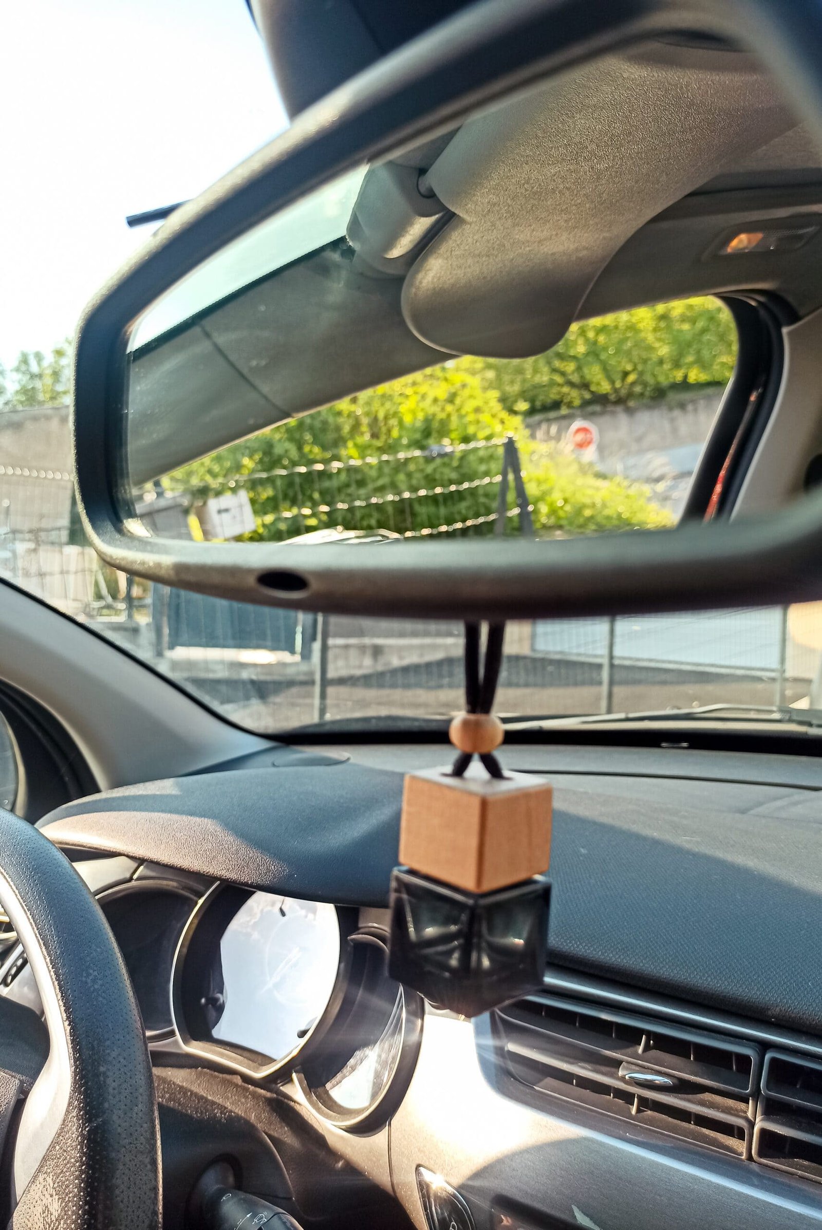 Ce petit cube en verre noir au couvercle en bois a une contenance de 8ml et diffuse son parfum durant 3 mois minimum. Vous pouvez facilement le suspendre au rétroviseur ou à une grille de ventilation grâce à ses liens réglables.
