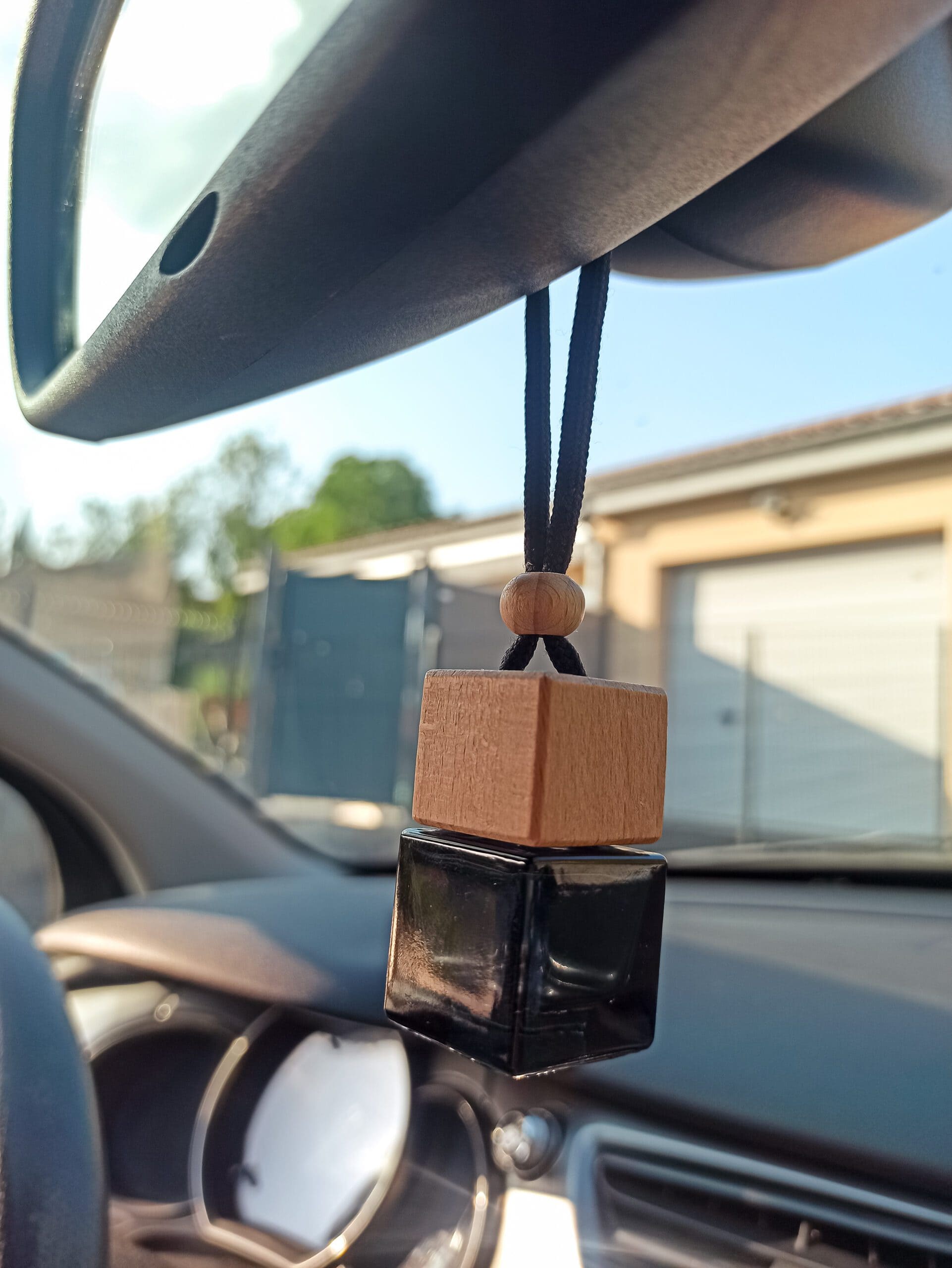 Diffuseur de parfum voiture “Cube Noir”. Diffusion 3 mois, design chic en verre noir et bois. Facile à suspendre au rétroviseur ou à la grille de ventilation.